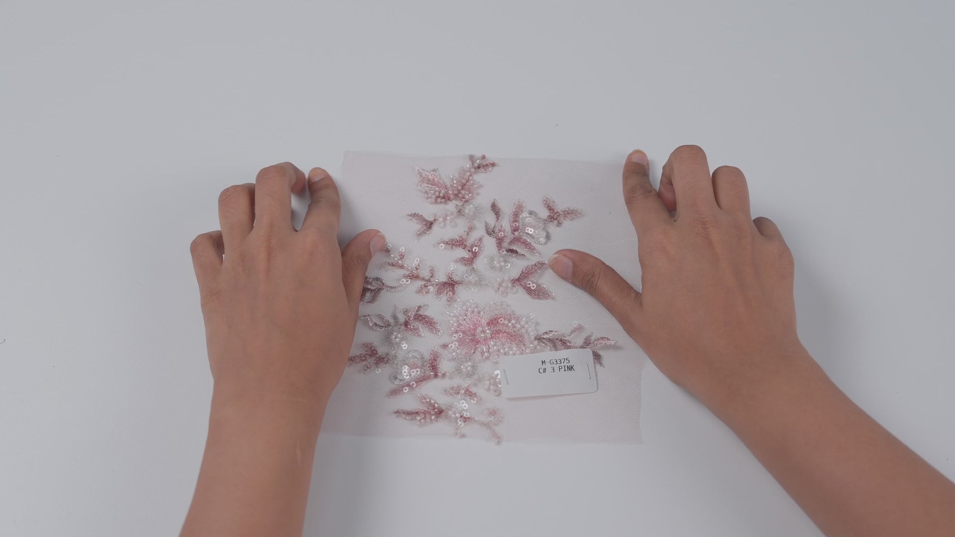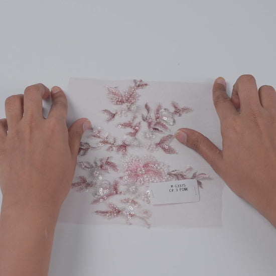 G3375 is an embroidered fabric constructed on a net base featuring multicolor, finely detailed embroidery arranged in floral compositions. The embroidery uses shaded thread work combined with bead and sequin accents, creating layered surface detailing and depth. The net base remains lightweight and sheer, allowing the embroidery to stand out while maintaining a fluid drape. The fabric has a soft fall with localized weight at the embroidered areas and a textured hand feel where embellishment is present, contrasted by the smooth net background.