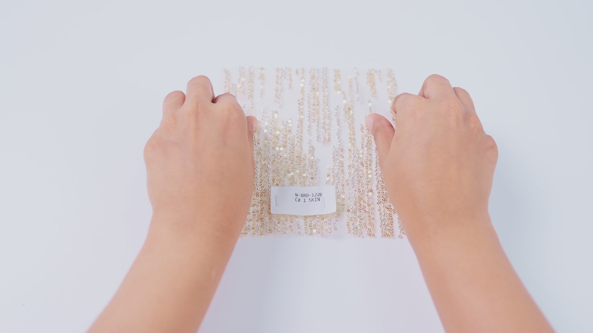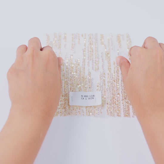 XRD-122E is a net base fabric featuring dense vertical cut bead embroidery enhanced with sequin highlights for added brilliance. The elongated linear layout creates a lengthening visual effect while delivering high shimmer and fluid movement, making it ideal for gowns, fitted silhouettes, and statement occasion wear.